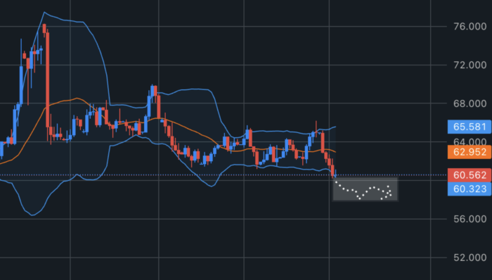Crude oil moves down accelerating the momentum near the bottom of the 20-day Bollinger Bands. The next possible support would be located around the $59-60 area, as the breakout of the $60 area may trigger some short selling and liquidations of leveraged long positions.